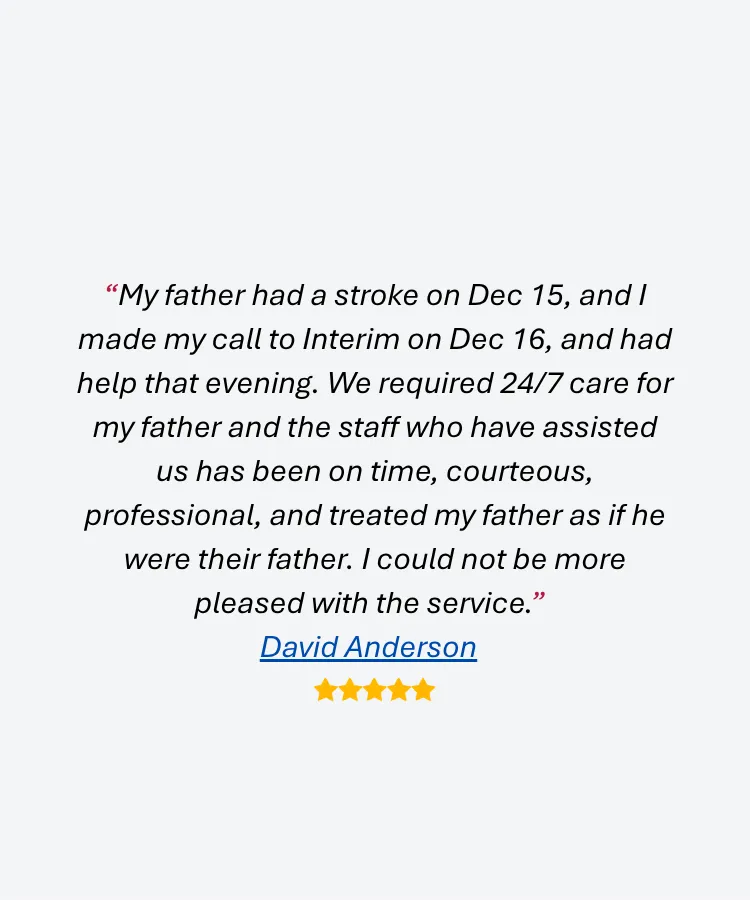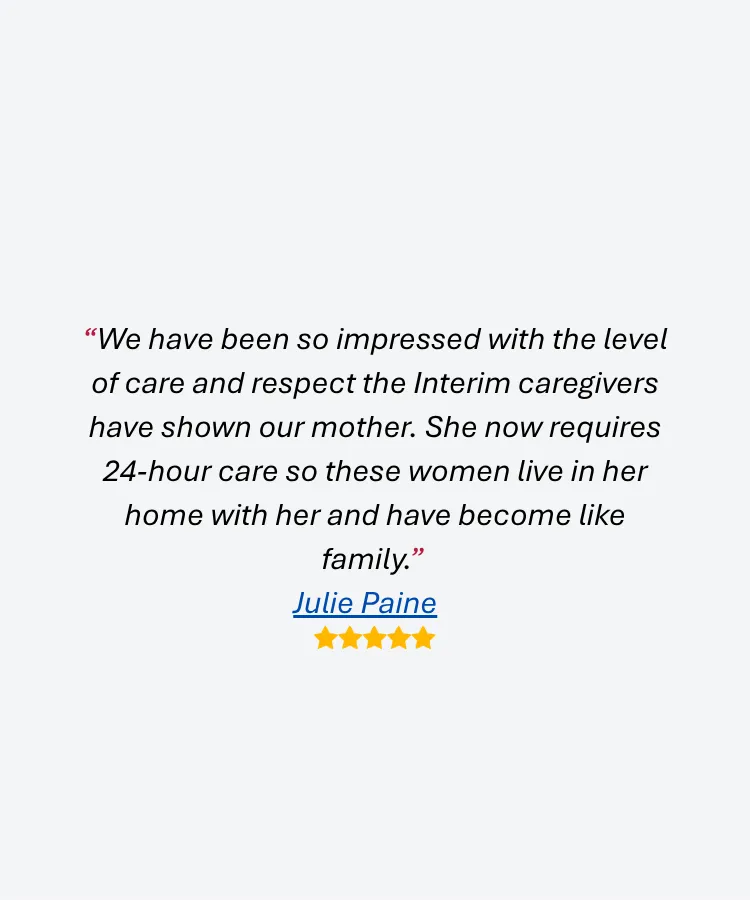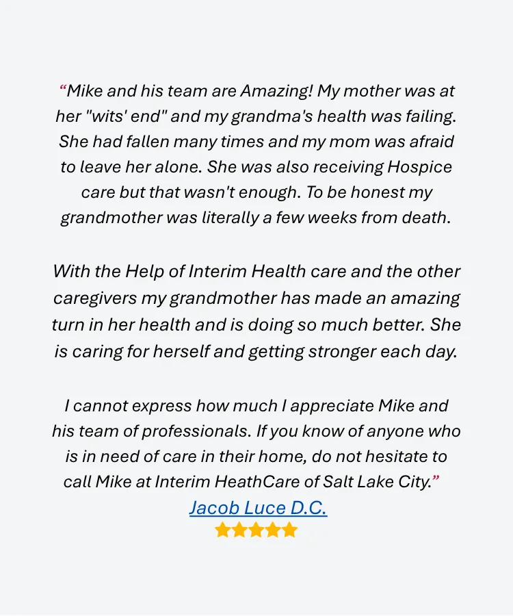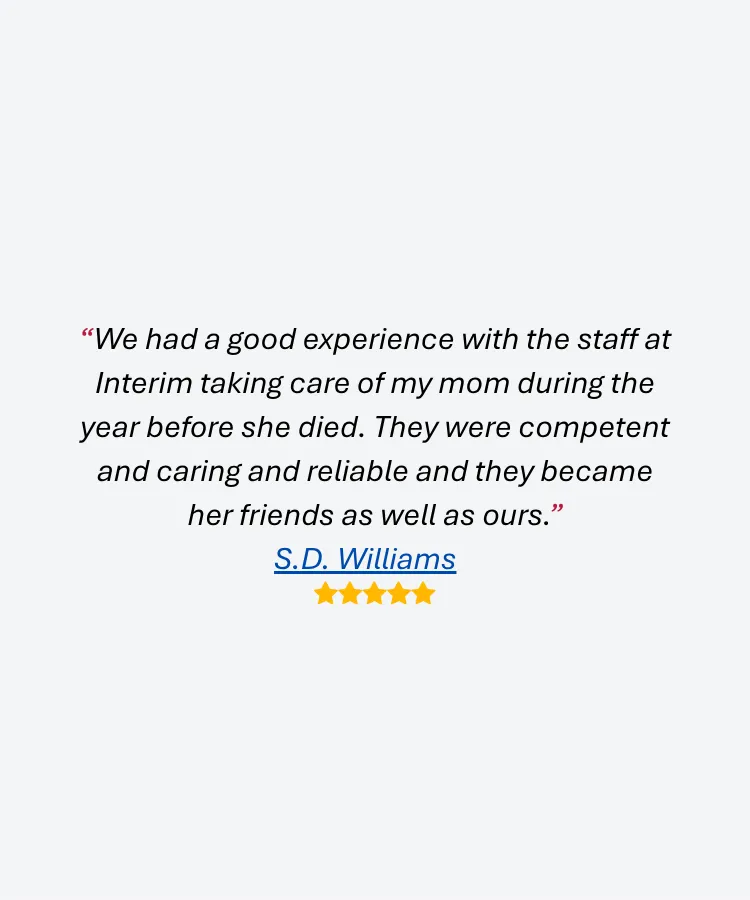 "Interim made it possible for my Mom to stay home safely. Their caregivers are incredible — I finally sleep at night.” — Sarah J., Salt Lake